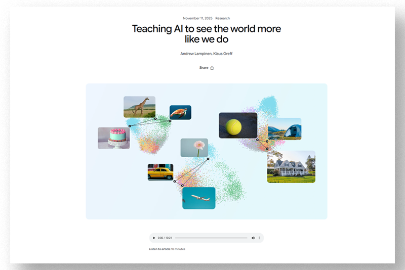 Aligning Machine and Human Visual Representations. (Nature, 2025). Introduces a method for fine-tuning vision models using human semantic structures to improve both interpretability and generalization performance.